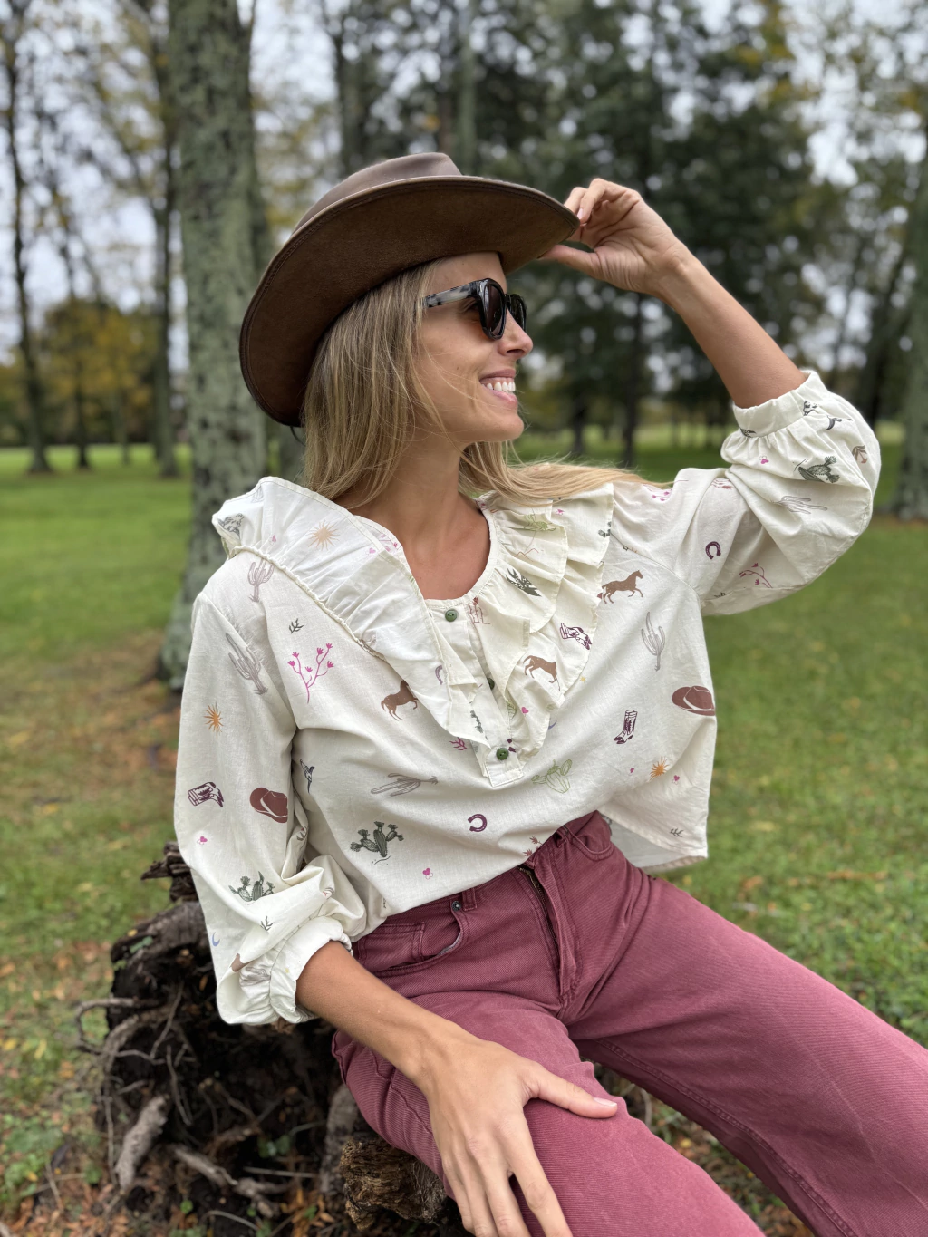 Blusa de voile con mangas tipo globo, puño con elástico para arruchar a la medida deseada, escote en V con dos volados y botones con utilidad.