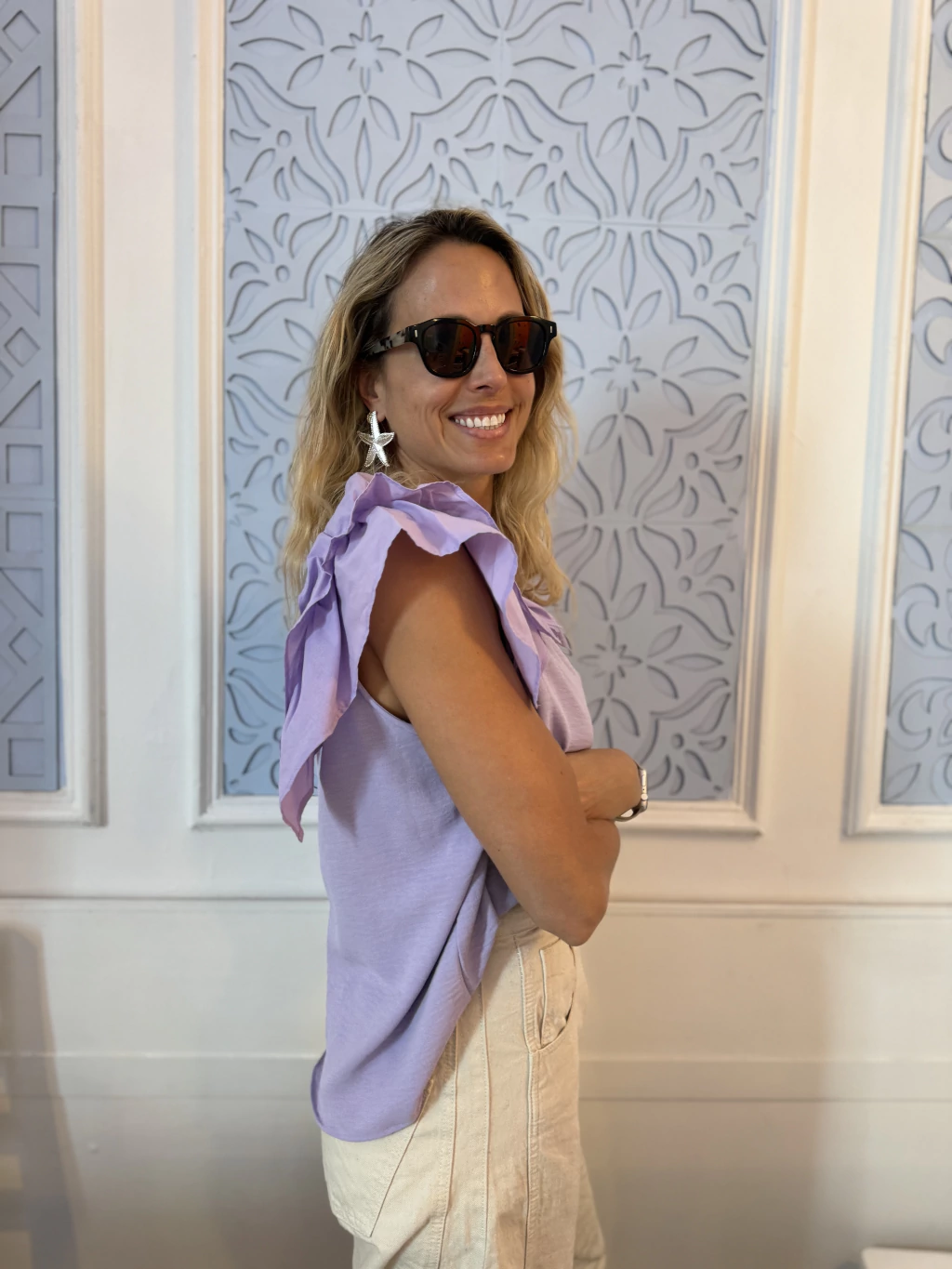 Blusa de creppe combinada con volados en los hombros de voile a tono.