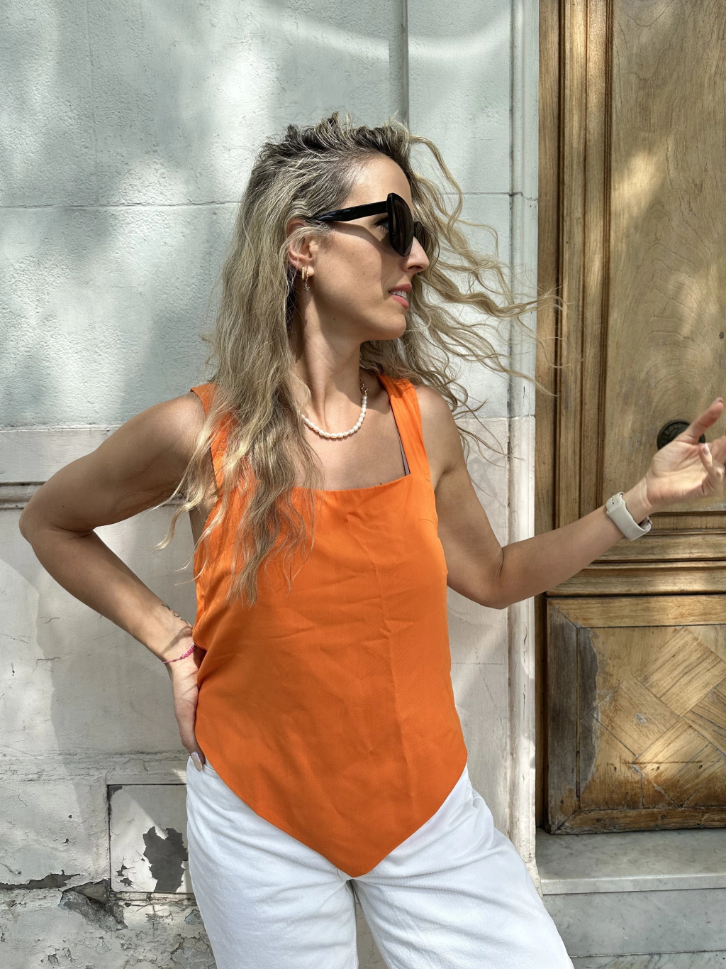 • Top de poplin liviano tipo pañuelo atado, con breteles anchos y en pico adelante. Amplio y todo embolsado con el mismo genero, por lo que no es traslucido.