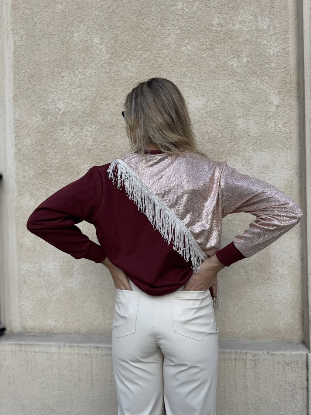 Buzo de algodón rústico combinado con foil y flecos de seda. Cuello a la base con terminaciones de rib de algodón. Largo a la cadera.