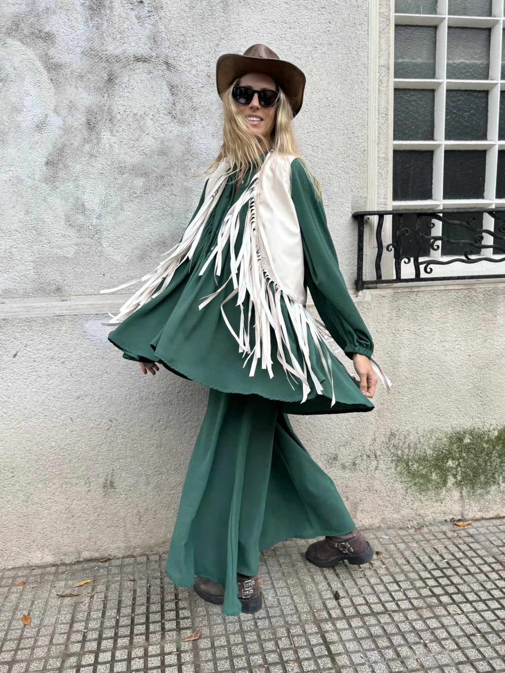 Chaleco de eco cuero doble con flecos largos del mismo género en todo su contorno.