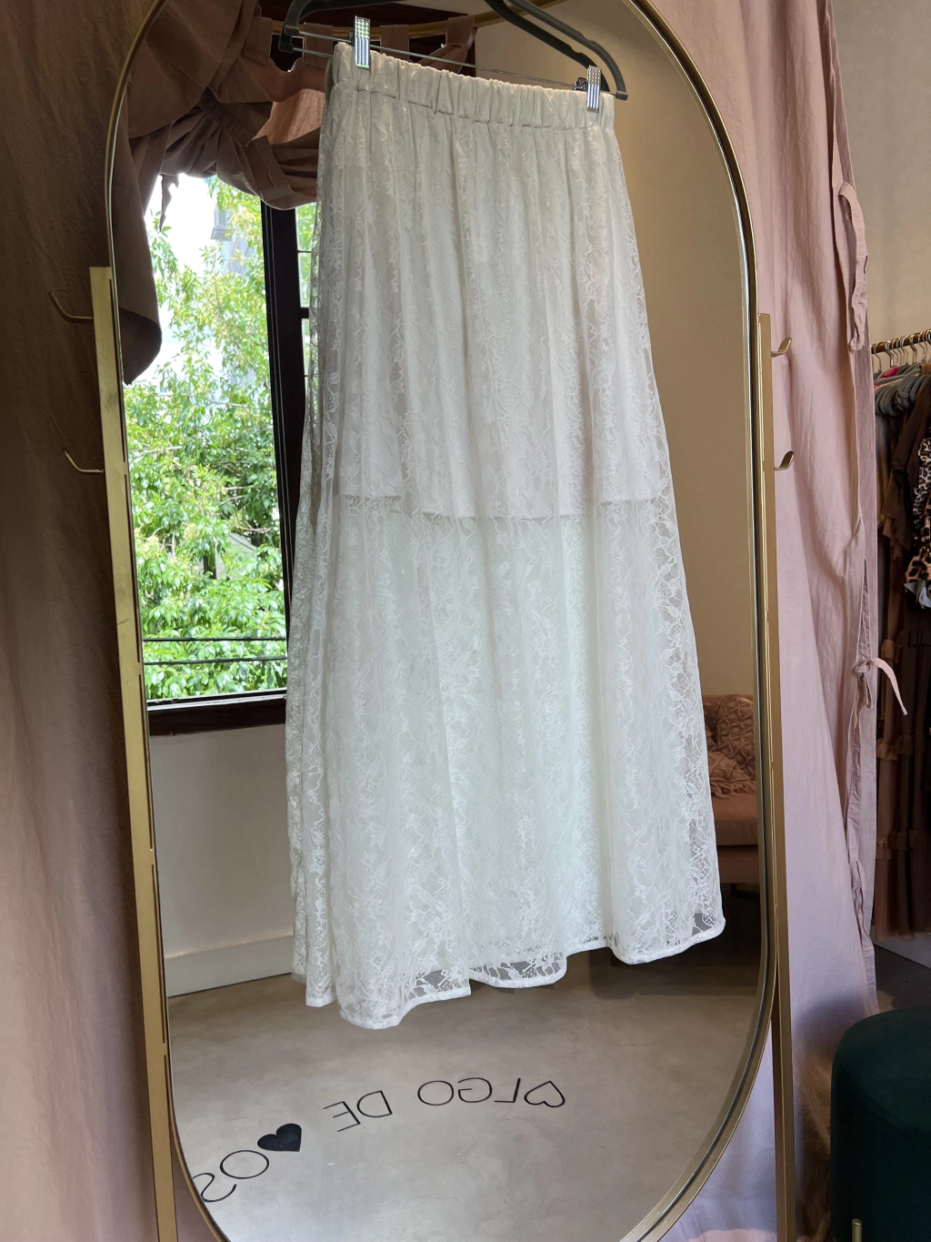 Maxi falda de encaje larga, de media campana con elástico en la cintura y forrería corta de seda fría