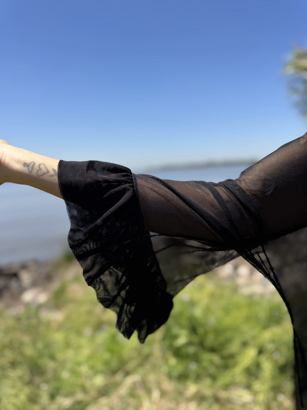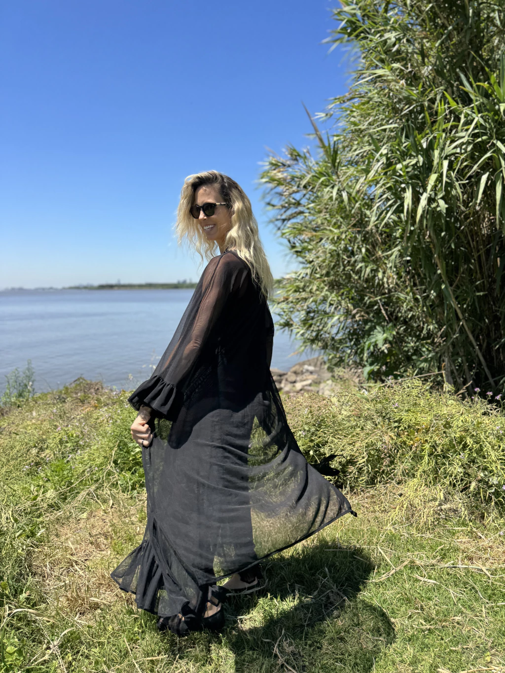 Kimono largo de tul con volado en las mangas y tajos en los laterales.