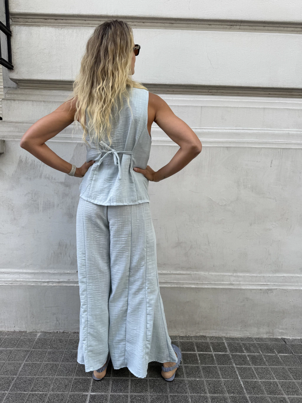 Palazzo simil lino con una hermosa caída, elástico y lazo fino en la cintura para ajustar a la medida deseada. Con pierna tipo palazzo que termina en semi campana bien oxford.