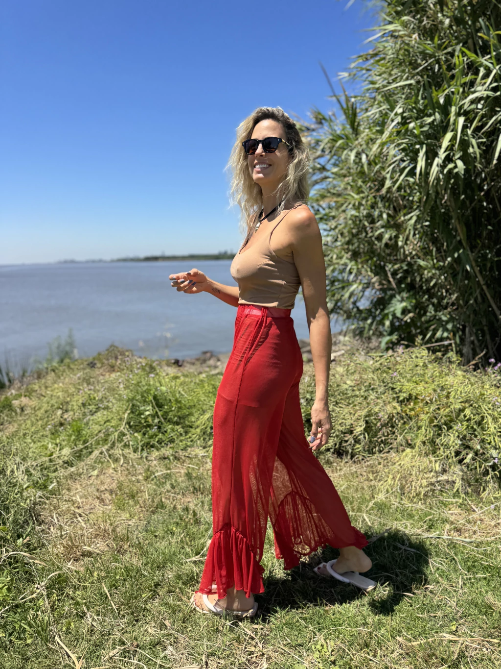 Palazzo de tul, cintura con elástico y pierna tipo palazzo con volado lateral.