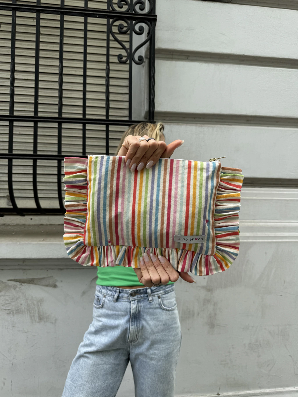 Sobre de lienzo estampado, forrado por dentro, cierre metálico y volados alrededor.