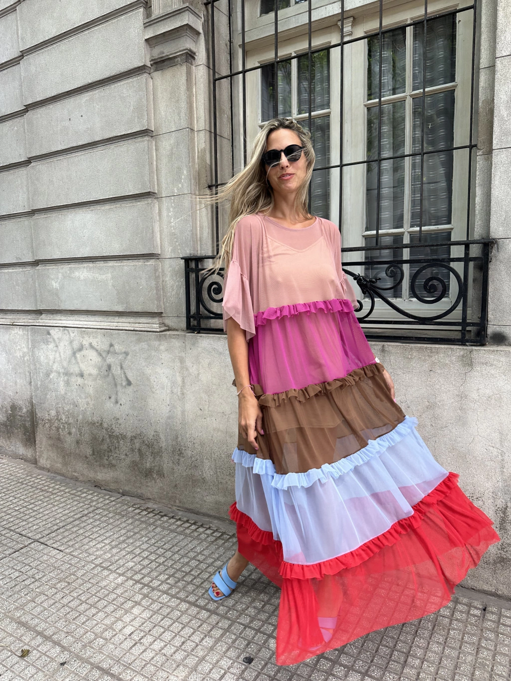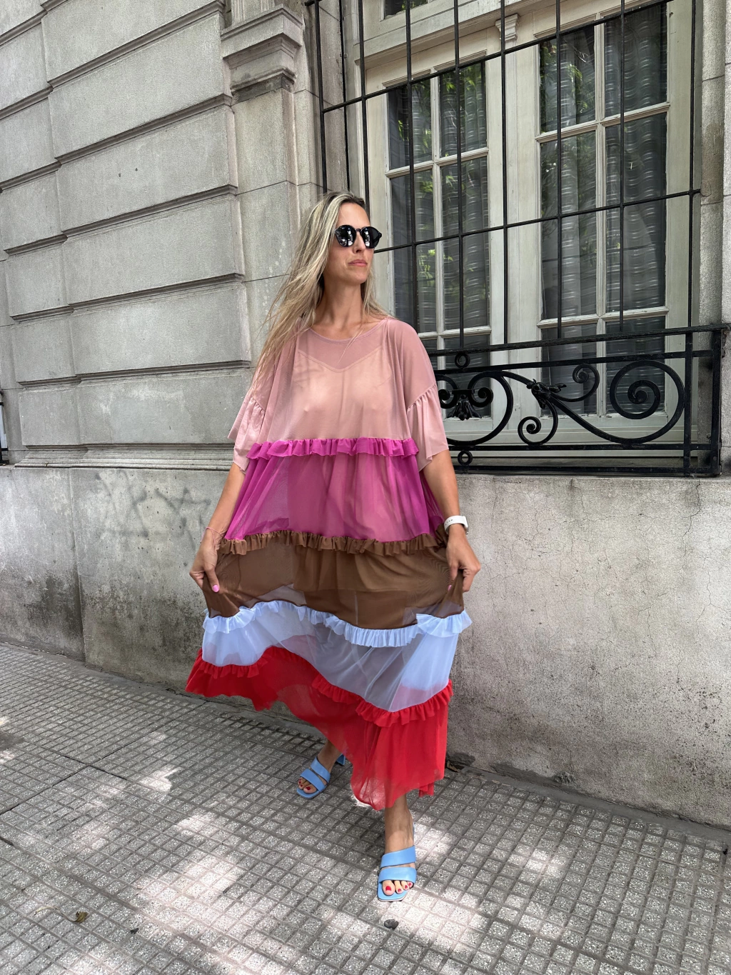 • Túnica combinada de microtul, con mucho vuelo. Se combinan 5 colores diferentes, larga al tobillo y mangas a modo de volado.