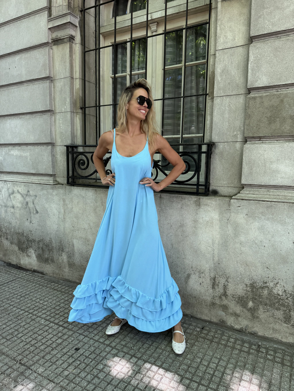 Vestido largo de creppe estampado con bretel fino, súper amplio con triple volado en la parte de abajo.